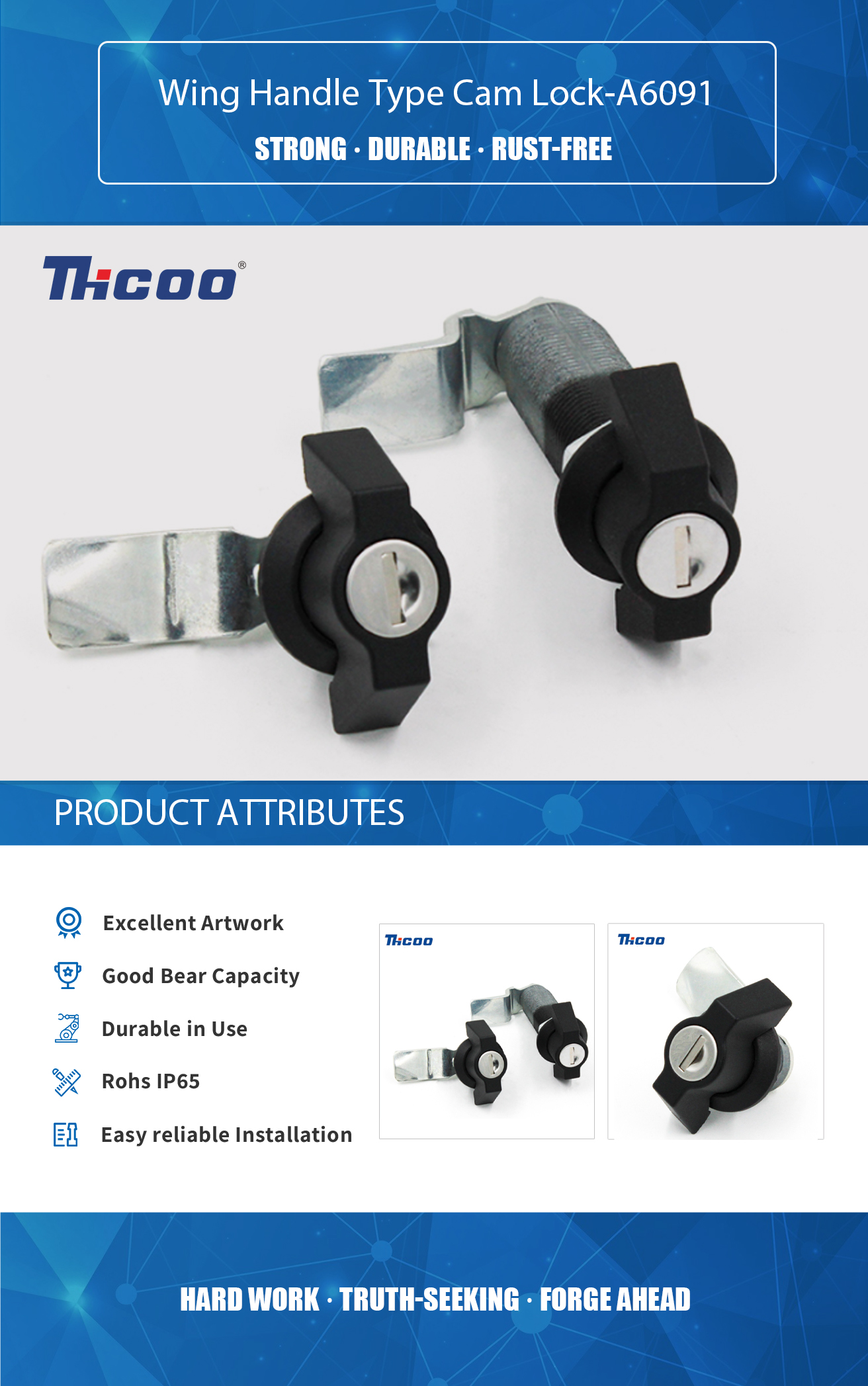 Imamo vlastiti laboratorij za ispitivanje i naprednu i kompletnu opremu za inspekciju, koja može osigurati kvalitetu proizvoda. Cam brava tipa Wing Handle-A6091 je glava brave koja se isporučuje sa zasunom. Ima malu izbočinu koja se uklapa u odgovarajući utor u tijelu zasuna. To je sjajan način da svoje stvari čuvate na sigurnom i zaštićenom tijekom putovanja ili jednostavno kada ih morate ostaviti u vozilu dok idete na javno mjesto.