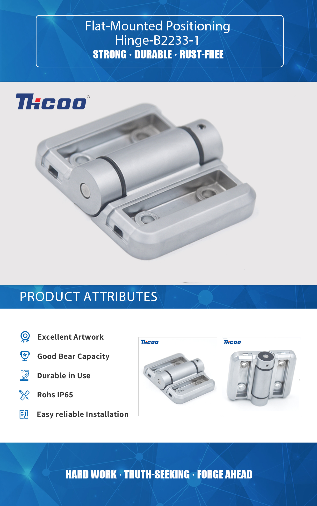 Imamo vlastiti laboratorij za ispitivanje i naprednu i kompletnu opremu za inspekciju, koja može osigurati kvalitetu proizvoda. Plosnate šarke za pozicioniranje-B2233-1  vrsta je šarki dizajniranih za držanje vrata, prozora ili druge pomične ploče u određenom položaju kada se ne koriste. Ove se šarke obično postavljaju na površinu ploče, a ne na rub.