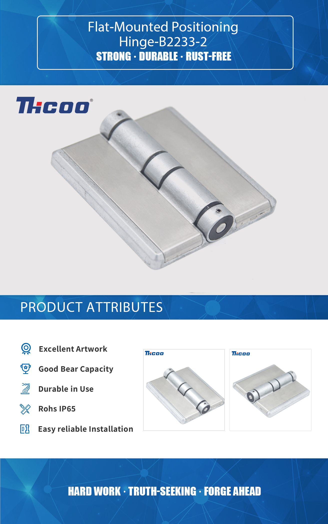 Imamo vlastiti laboratorij za ispitivanje i naprednu i kompletnu opremu za inspekciju, koja može osigurati kvalitetu proizvoda. Ravno montirane šarke za pozicioniranje-B2233-2 koriste se u različitim primjenama gdje je važno držati vrata, prozor ili drugu ploču u određenom položaju kada nisu u upotrebi. Uređaji za držanje vrata otvorenima: Ove šarke su često se koristi za držanje vrata otvorenima pod određenim kutom, omogućujući lak prolaz kroz vrata.