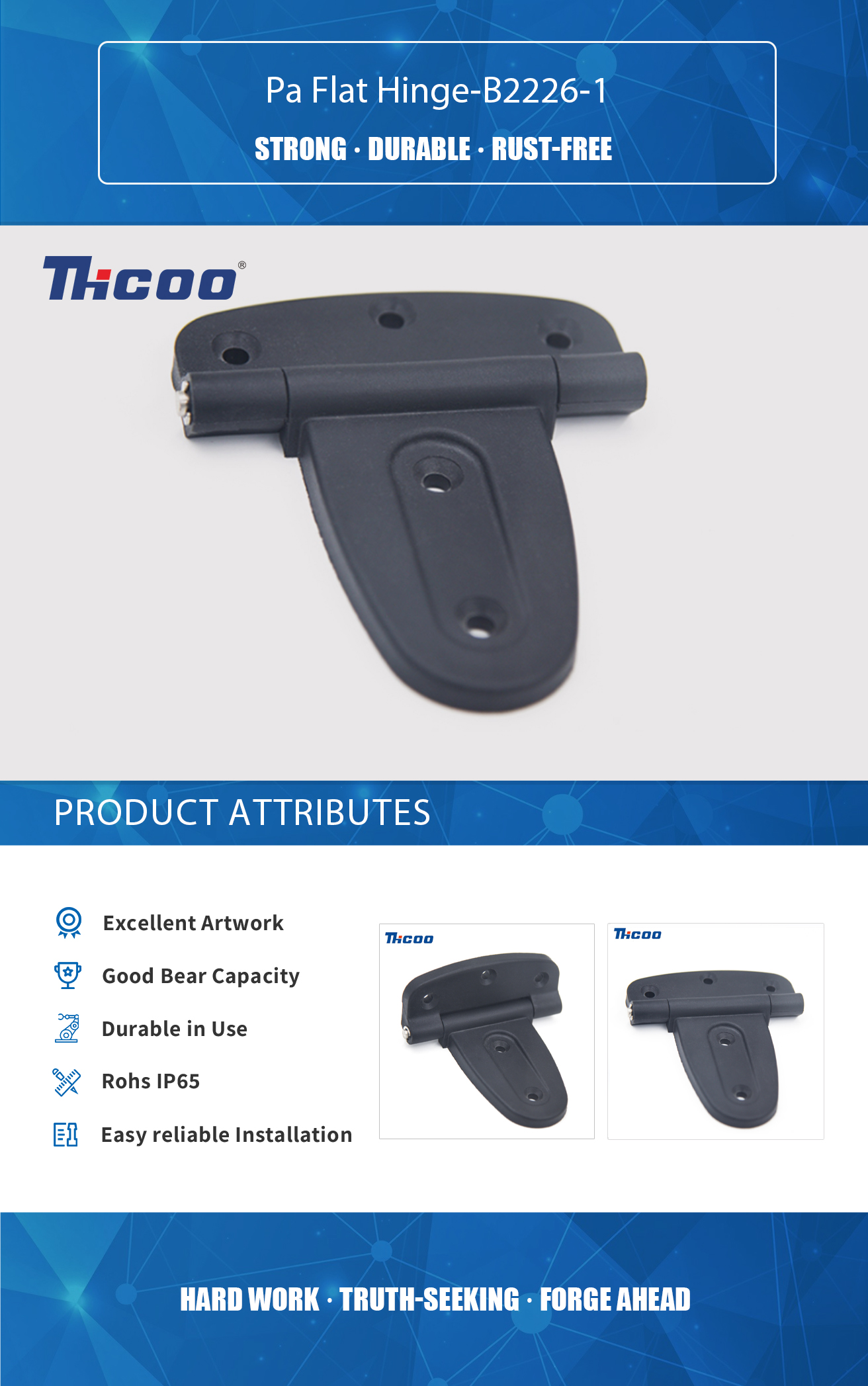 Imamo vlastiti laboratorij za ispitivanje i naprednu i kompletnu opremu za inspekciju, koja može osigurati kvalitetu proizvoda. Pa Flat Hinge-B2226-1 može se koristiti u različitim primjenama, a dostupni su u nizu veličina i stilova koji odgovaraju različitim dizajnerskim i funkcionalnim potrebama. Prilagodljivost: mnoge PA ravne šarke dizajnirane su da se mogu podešavati, omogućujući fino podešavanje položaja dijelova nakon instalacije.