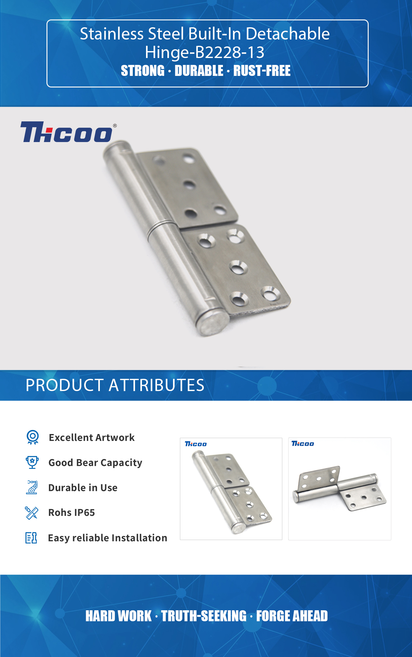 Imamo vlastiti laboratorij za ispitivanje i naprednu i kompletnu opremu za inspekciju, koja može osigurati kvalitetu proizvoda. Ugrađena odvojiva šarka od nehrđajućeg čelika-B2228-13 je vrsta šarke koja je izrađena od nehrđajućeg čelika i dizajnirana je za ugradnju u objekt, kao što su vrata ili ormarić, s listovima šarke skrivenim ili skrivenim kada je predmet zatvoreno.