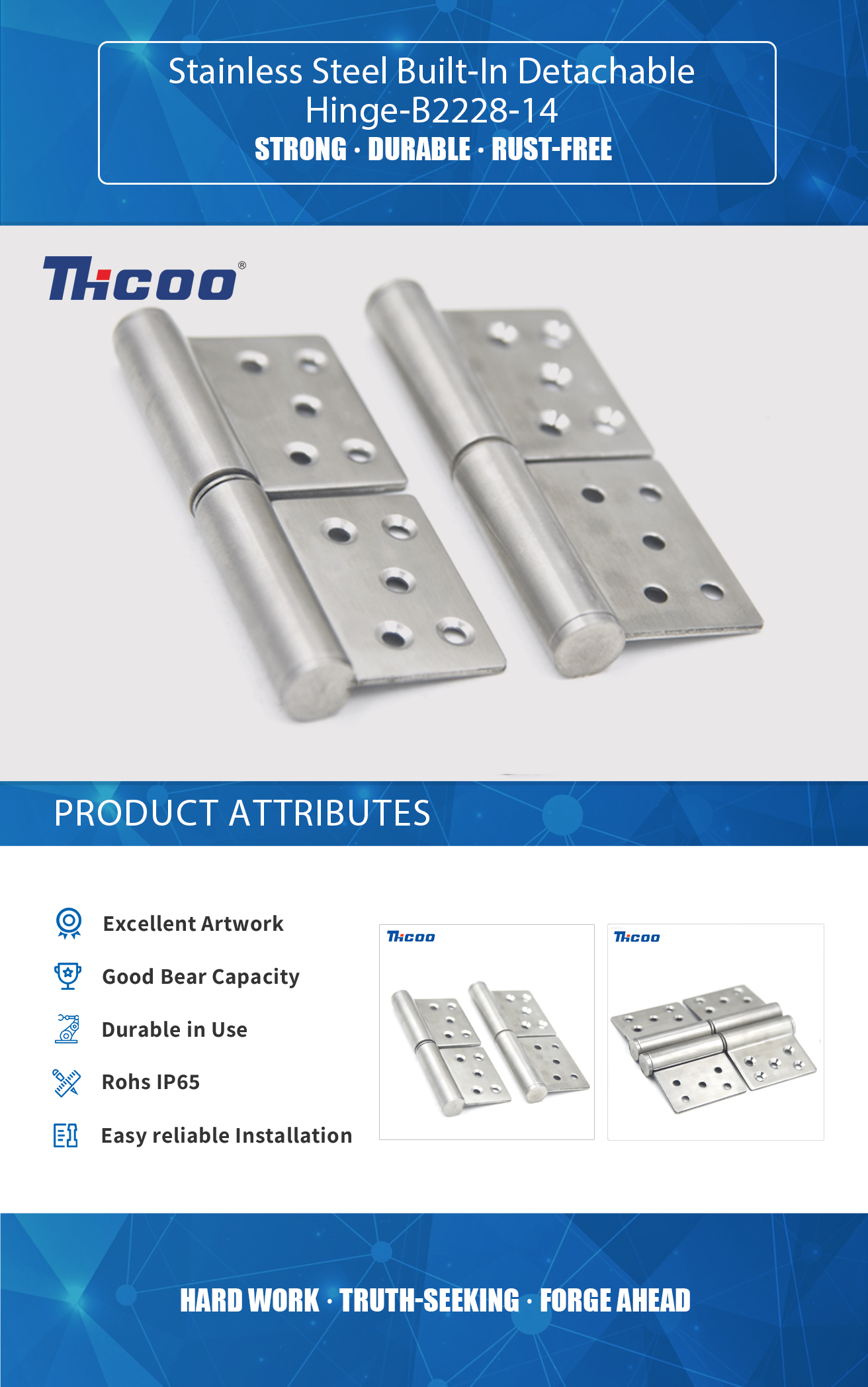 Imamo vlastiti laboratorij za testiranje i naprednu i kompletnu opremu za inspekciju, koja može osigurati kvalitetu proizvoda. Ugrađene odvojive šarke od nehrđajućeg čelika-B2228-14 je jednostavna instalacija: Ugrađene odvojive šarke od nehrđajućeg čelika često su dizajnirane da jednostavan za instalaciju, uz minimalan potreban alat ili hardver.
